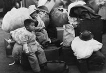 Japanese Americans waiting for a train to take them to Owens Valley, California, photograph by Russell Lee, April 1942