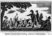 “Captains Lewis and Clark Holding a Council with the Indians,” etching by Patrick Gass, Journals of the . . . Corps of Discovery, 1810