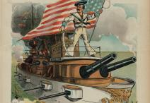 “The Modern Sphinx has Spoken: The American Battleship is No Longer an Unknown Quantity,” chromolithograph by Louis Dalrymple, Puck, June 1, 1898