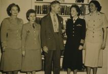 Secretary of Defense James Forrestal congratulates Colonel Geraldine May, Colonel Mary A. Hallaren, Captain Joy Bright Hancock, and Major Julia E. Hamblet after passage of the Women’s Armed Services Integration Act, photograph by U.S. Army Signal Corps, 1