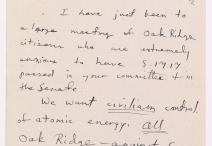 Letter from Sally Cartwright, Oak Ridge, Tennessee, to Senator McMahon of Connecticut, March 6, 1946